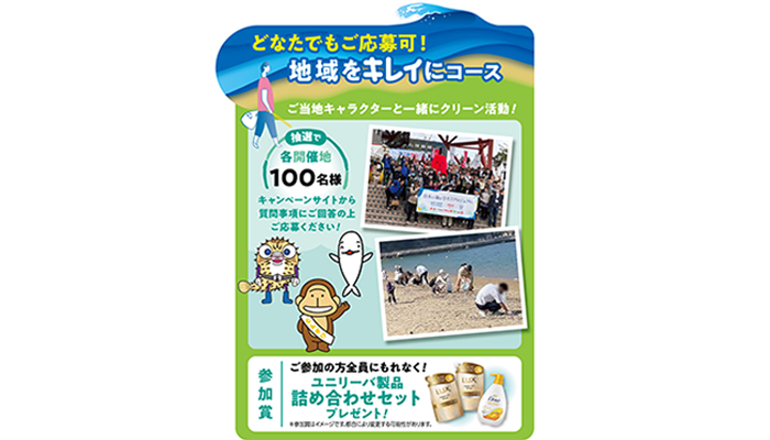 どなたでも参加可能!ご当地キャラクターと一緒にクリーン活動。ご参加いただいた方全員にもれなくユニリーバ製品詰め合わせセットをプレゼントいたします。